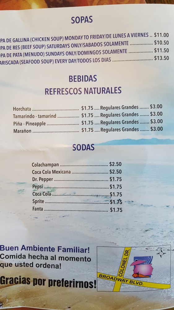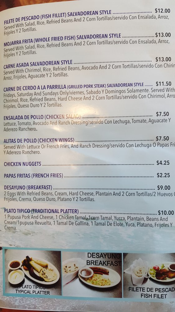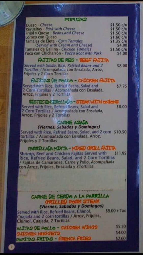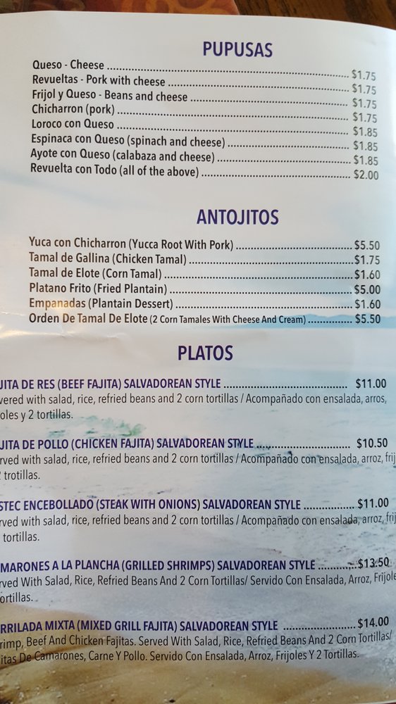 The menu captures the essence of home-cooked comfort, showcasing an array of enticing options. Start your culinary journey with Empanadas (Plantain Dessert) and Tamal de Elote (Corn Tamal) for a taste of authentic antojitos at just $2.00 and $1.75, respectively. The highlight, however, lies in the diverse selection of pupusas, including Chicharron (Pork) and Espinaca con Queso (Spinach & Cheese), each priced at $2.00.